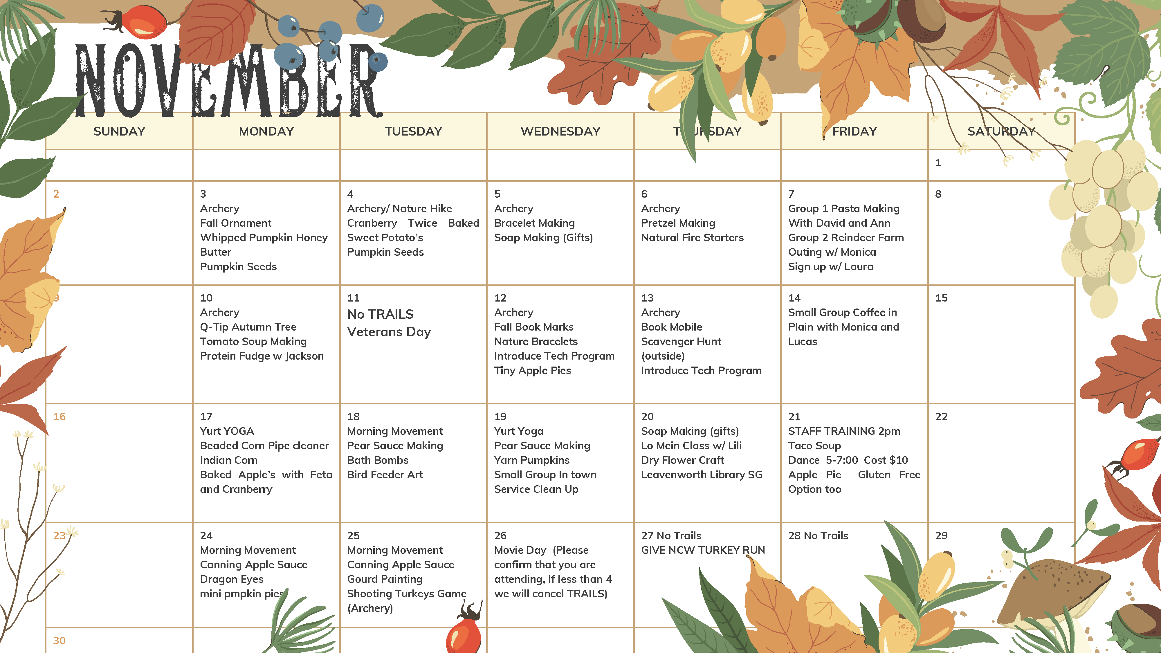 Trails runs Monday-Thursday from 10:00 am until 3:00 pm and small group activities on Fridays.